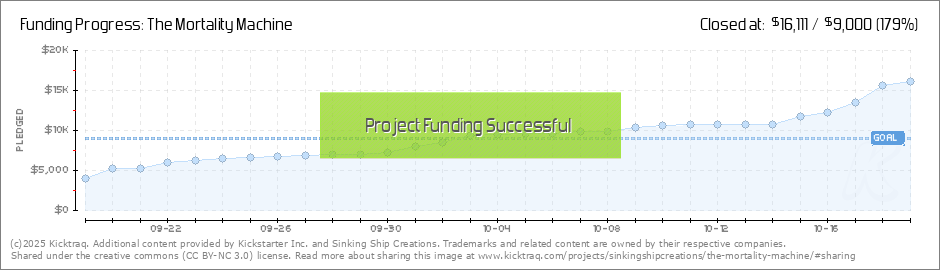 Welcome to The Mortality Machine First and foremost, thank you. Before we hit the 24-hour mark, we're already at 47% of our initial goal... $4,255 of $9,000. It's both humbling and invigorating to see 75 people immediately show their support for our... (Read More)