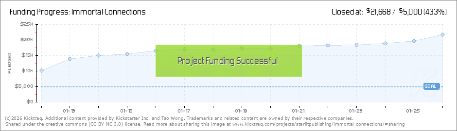 We did it! The Immortal Connections Kickstarter is officially fully funded, and it happened incredibly fast thanks to your support. We'll be announcing the first stretch goal soon, so keep your eyes on this page... -Tao & the Starlit Publishing... (Read More)