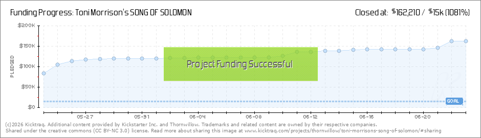 Dear friends, Profuse and vigorous thanks to all of you who jumped in early to help get our Song of Solomon campaign off the ground. Your fast support will make is making it possible for us to make the first ever fine press edition of Toni... (Read More)