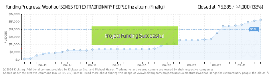 Thank you, thank you, thank you!!! We did it! Songs For Extraordinary People has been successfully funded. And with six days remaining! This means people can still contribute. Why not go for $6000? A "stretch goal," I believe they call it? Perhaps we... (Read More)