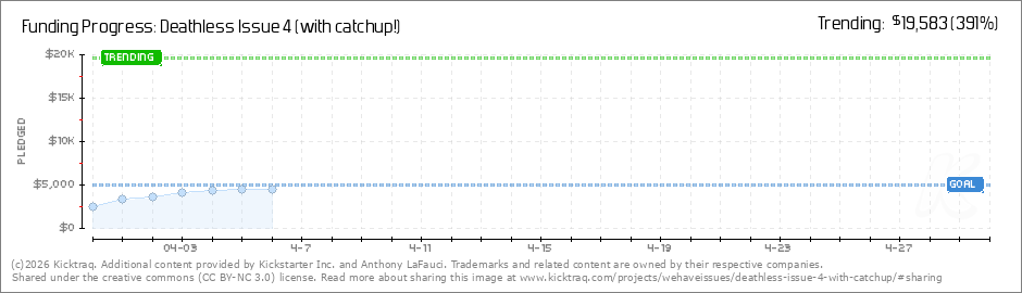 Help your backers reach your daily goals and help others see how you're doing. It's easy, with Kicktraq Mini.Here are a few quick snippits of code you can use to embed your personalized widget on your website, in your blog, and even on your favorite forum.