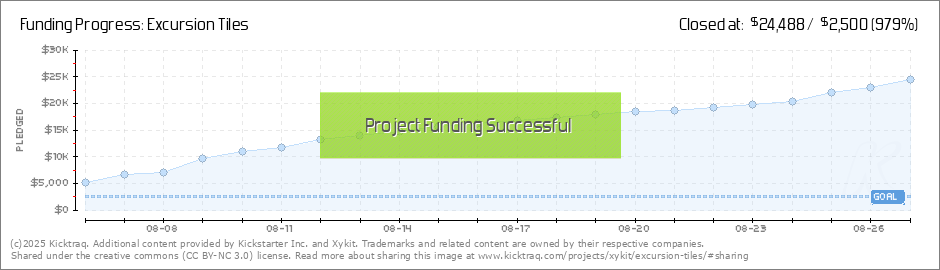 Good Day Adventurers We are a little over 24hrs into this project and we've already unlocked 2 stretch goals! Thank you all for joining in to bring Excursion Tiles to life. I'm so excited, with your support, we've unlocked 30 NEW tiles already,... (Read More)