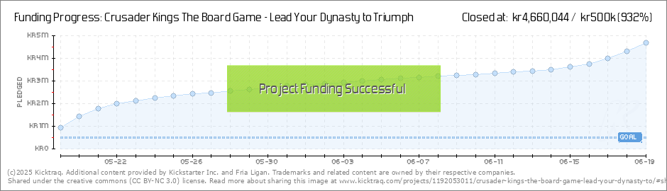 Hi! Another stretch goal is passed in the kickstarter for Crusader Kings - The Board Game. A bonus scenario based on the Baron's Crusade will now be added to the game. Thank you for your support! We now only have one more stretch goal lined up, and... (Read More)