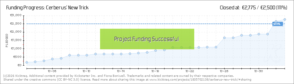 Hi Folks, So Brendan and I are into the final week of our Kickstarter for Cerberus' New Trick and we are delighted to say that we are now 67% funded. Thank you so much for your support of this project. Whether through backing or sharing our... (Read More)