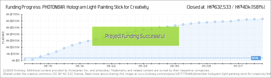 Dear backers, Our campaign has just passed a third and we have received over 800% of the funding! 🎊This is just amazing! Thanks to your overwhelming support! 👏 Photonbar project team is striving to make light paiting art become more popular in... (Read More)