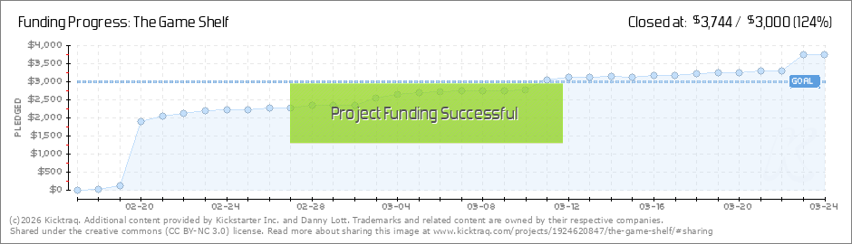 We did it! Firework Explosion Effect! (pop, "oooh," crackle, "ahhhh.") We reached our funding goal with 11 days left to go! This is the greatest news we at The Game Shelf have had all day. So, there are a few things that will be happening because... (Read More)