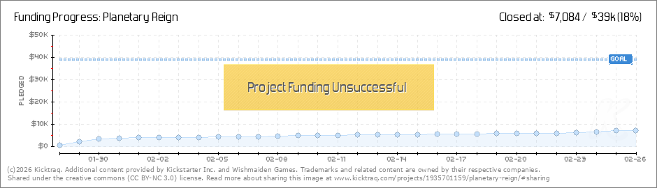 Hi all, or should I say good day! Its half time and even though its not looking good, the game is not over (pardon the pun). Thanks to the backers and please hang in there as Planetary Reign will reign one day, whether now or later in the year. ... (Read More)