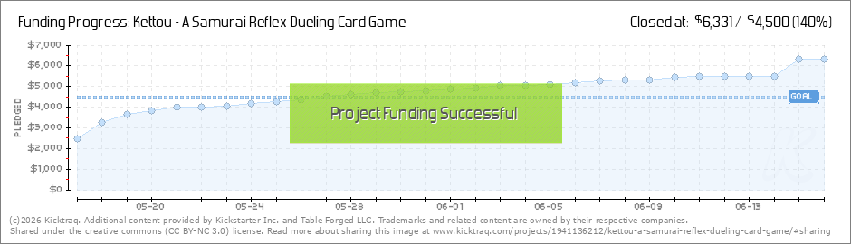 YOU GUYS DID IT!We unlocked our first Stretch Goal. Each copy of Kettou will now include the bonus TSUKI reader card. The new TSUKI Reader Card is a unique card. Unlike the other Hit Location Cards TSUKI is a Reader only card. When TSUKI is... (Read More)