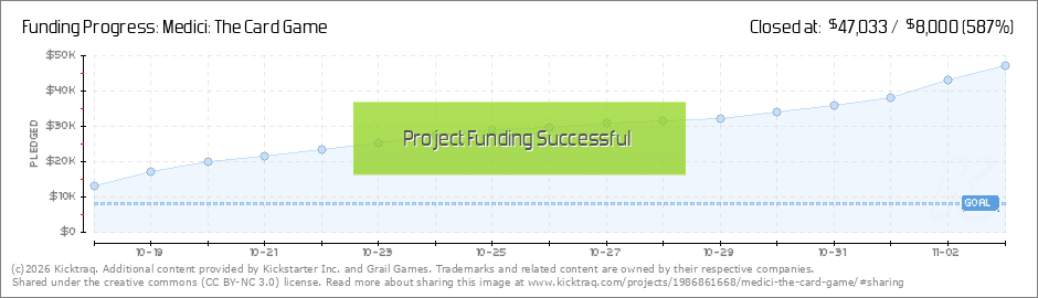 Hello to all 1041 backers of Medici: The Card Game! Thanks so much for your continued support! With six days remaining, this looks set to be Grail's most successful Kickstarter campaign ever. We can't wait to get this stunning game into your hands! A... (Read More)