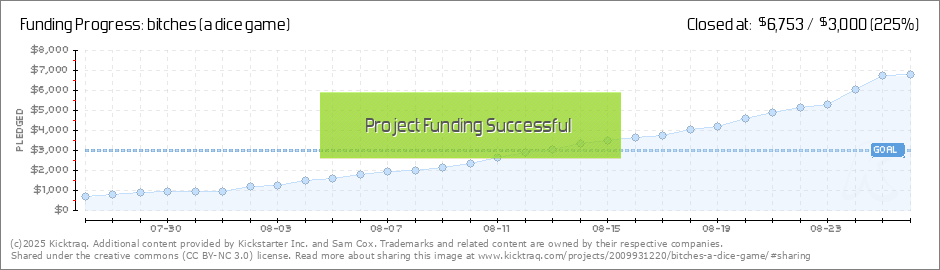 Bitches (a dice game) made it!! It’s gonna be a reality!! Thanks to the 107 pledgers that made this happen. Less than an hour ago, the campaign reached its goal, and it is still going up. I don't think I can explain the immense joy I am feeling... (Read More)