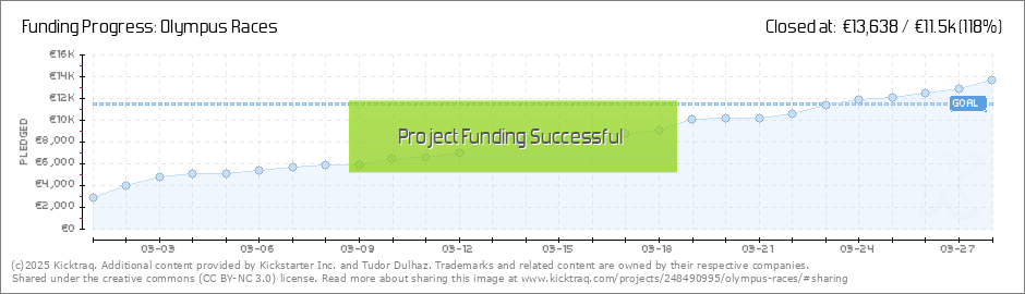 Dear everyone, As we are now entering the final days of the project, I'm happy to announce that Olympus Races is now 89% funded! This is amazing, and only made possible by each and every one of your contributions, wahooo!!! Keep in mind that... (Read More)