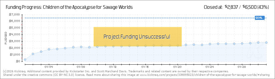 Hello, backers! I was very pleased to see us cross the $2000 mark - we're creeping up, slowly and steadily, on the funding goal that will bring you Children of the Apocalypse with fantastic art depicting the setting. Have questions about Children of... (Read More)