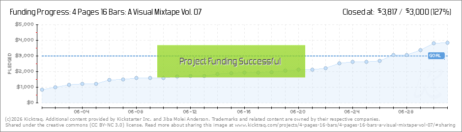 We reached our goal thanks to you! Success! With 83 backers and 70 hours left in the campaign, 4 Pages 16 Bars: A Visual Mixtape Vol. 07 - Mass Appeal has achieved its funding goal. Of course, this would not have happened without you believing in... (Read More)