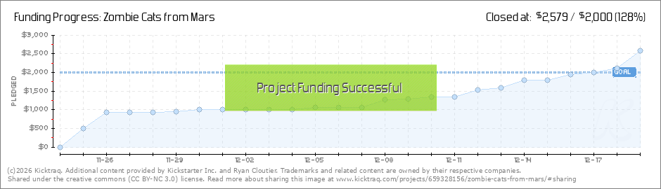 Hello Zombie Cat People! Oh, we made our goal! This is wonderful, and the Cats THANK YOU for your pledges! I'm so relieved that I'm assured the crew will get paid. But! We have 69 hours to go, and more pledges is more better! Props, Craft Services,... (Read More)