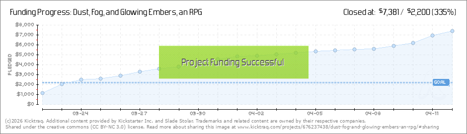Hello all, It's great to see the impressive support that Dust, Fog, and Glowing Embers is getting. I love the momentum and enthusiasm. Now that I see the track that we're on, I'd like to insert a new stretch goal at $3500. This is just a... (Read More)