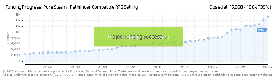 Backers: Make sure you download your PDF via the link in update #51. We'll be taking it down soon. If you know anyone who wants to purchase Pure Steam, they can do so through DriveThruRPG, Paizo, or our website. Thanks for all the support, and we'll... (Read More)