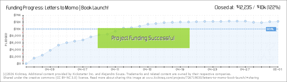 DEAREST LOVING BACKERS! It's official, Letters to Momo will get published thanks and only thanks to all of YOU!!!! UA! In 13 days and with 200 backers (up to now), together you have ensured that these letters will walk with others, everywhere!... (Read More)