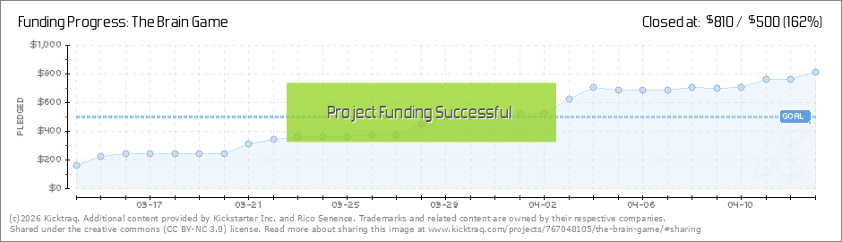 Thank you all for the support so far. We've officially reached the half way point for making The Brain Game come to life (well, beyond the prototype anyway!). Big shout out thanks to Matt and Gary for pledging at the Executive Producer of the game... (Read More)