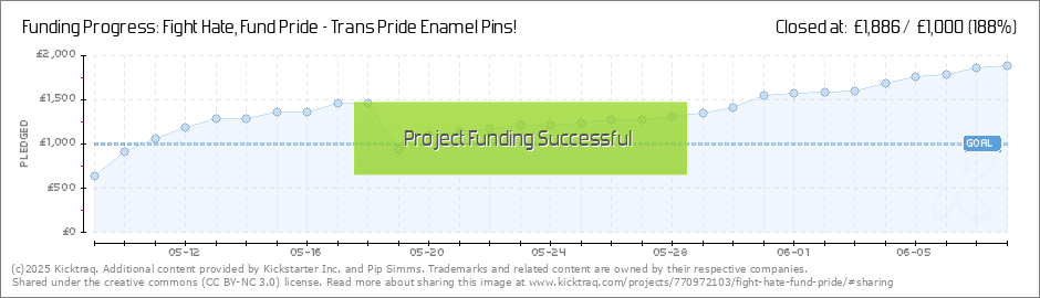 Good morning beautiful backers! With just 12 hours to go I want to thank you to all of you for supporting Trans Pride Exeter this year. I'll be sending out the backer surveys in the next few days; Please fill out your enamel preferences asap and... (Read More)