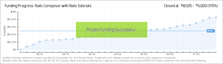 Exciting news! The Kickstarter campaign for Rails Composer has reached the $5000 funding goal with 97 backers in 20 days. I'm already working on the improvements to Rails Composer. We've got 9 days to go and I've added a STRETCH GOAL! If the campaign... (Read More)