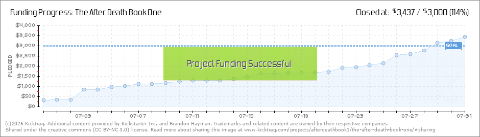 Good morning all and happy weekend to you! I woke up to some great news: The After Death Book One has been fully funded! We reached our goal--we all get After Death books!! A huge thanks to everyone that has pledged to this project. It can't be... (Read More)