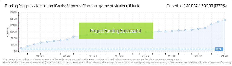 Well, that was fast! Thanks to you amazing people NecronomiCards was funded in under 7 hours, with 30 days left on the clock! I'll hafta hammer out the details before I post stretch goals, because I had 0 expectation it was going to happen that fast.... (Read More)