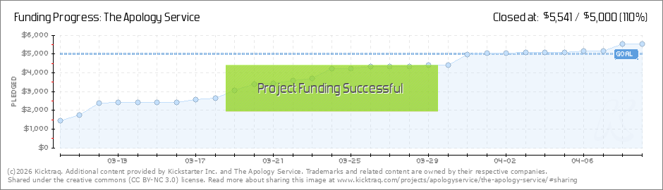 This calls for a celebration! We hit our goal of $5,000! Thank you so much to all you backers! Please help us to keep spreading the word about The Apology Service. There are still 6 days left and we plan to continue raising funds. After the campaign... (Read More)