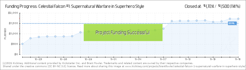 Hey all! We hit 50 backers earlier today and jumped from 59% to 71% funded! Thank you to the new backers that came out in support of Celestial Falcon and took us up to that 50 backer milestone! So let's reveal one more of the comics in the digital... (Read More)