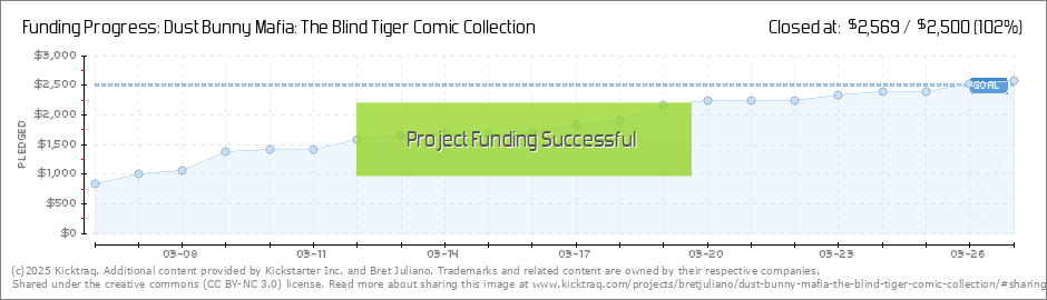 So, there's only 9 more days to get in on the Blind Tiger Kickstarter, but I've decided to sweeten the deal. For this week only, every backer who pledges $15 or more to the Blind Tiger Kickstarter, will get the first Dust Bunny Mafia comic... (Read More)