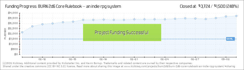 At the end of day three BURN 2d6 is humming along. Craig Brasco and I decided to bring on a character sheet specialist and Kris McClanahan agreed to join the team! This will allow Craig to focus on the half-page color art and remaining lineart for... (Read More)