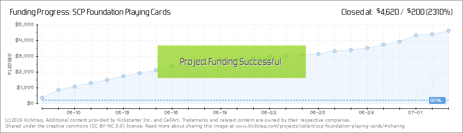 Dear SCP fans on Kickstarter, Thanks so much for your love & support! We were able to achieve our goal within the first 24 hours after launching this project. The playing cards are here and they look and feel great! Check out this open-box video:... (Read More)