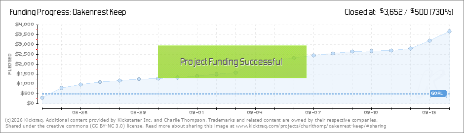 Oakenrest Keep is FUNDED!!!!!!!! Thank you so much to everyone who has backed so far! There is still a long road ahead before the end of the Kickstarter Project, but to keep things moving Ill have an update coming soon that will talk a little bit... (Read More)