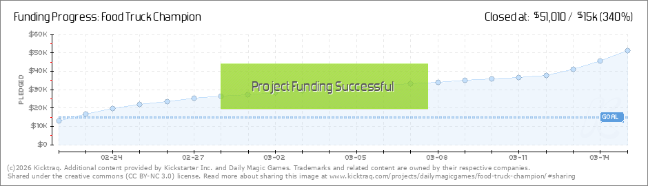 Hey Foodies...Well, you did it. About 8:00 this morning your support pushed us over the $15,000 mark to make Food Truck Champion a success! Congrats! You know what comes next...Stretch Goals! Bigger Better Food Truck @ $20KOne of the key game... (Read More)