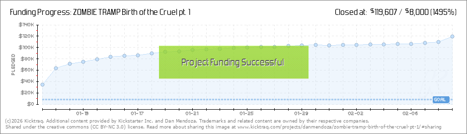 What's up Zombie Tramp Fans! looks like we've hit the 100K mark. Fantastic news! Now unlocked is a 4 Inch full color enamel pin of Xula. Add on a Kinked edition for $20 Thank you everyone! next up , we will be releasing 11x17 prints. stay tuned! -Dan... (Read More)