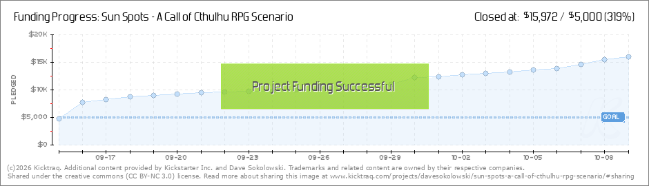 Hello all! Welcome to our new backers, ongoing thanks to our no-so-new backers, and congratulations to us all for hitting the $12k stretch goal. This gets us a bunch of pre-generated Call of Cthulhu characters added to the GM kit, making it easier to... (Read More)