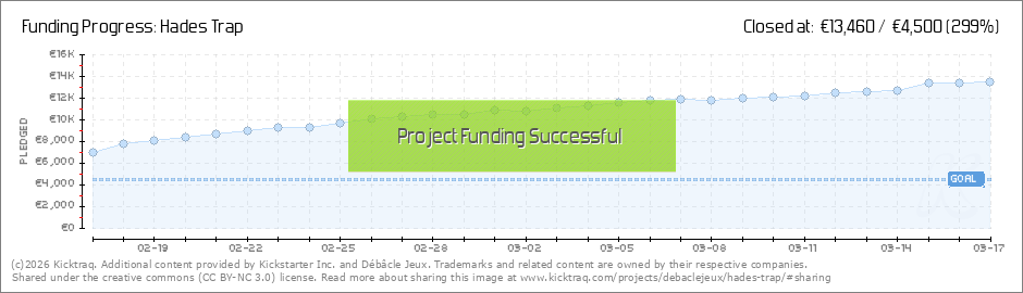 Dear backers, Thank you to all the 240 backers who supported our campaign. Thanks to you, HADES TRAP is already fully funded and 2 goals unlocked : Achille, new hero and dual layered player boards. Now, we need your support to achieve this new goal... (Read More)