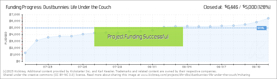 After two full days, the Dustbunnies project has reached 70% of the funding goal. Big Hugs to all our backers. Please reach out to your friends and ask them to pledge, too. That's how the Dustbunnies roll. It's all about teamwork. (Read More)