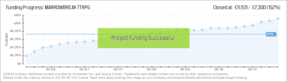 Hey all! We are now one week into the Kickstarter campaign for MARROWBREAK, and we're over 75% funded! Thank you all so much for the support, especially to those sharing the campaign with their friends, gaming groups, and anyone else you can get to... (Read More)