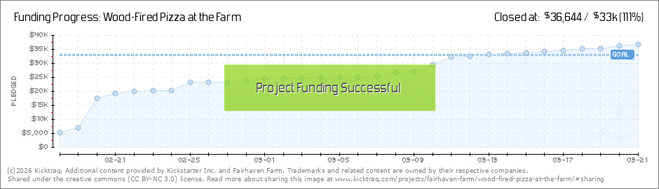 We're over halfway to our goal! You'll need an HTML5 capable browser to see this content. Play Replay with sound Play with sound 00:00 00:00 Thank you all so much for your enthusiastic support of our Pizza Farm dream! We are over halfway to our... (Read More)