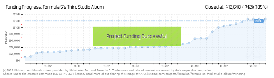 Hello everyone! Thank you for your support of Formula 5's Kickstarter campaign for our third studio album. We are ecstatic with the early response and 20% of our goal achieved in just FOUR DAYS! We are well on our way to our goal of producing a... (Read More)