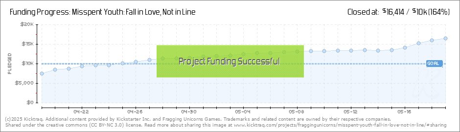 Ten-Thousand Hoorays! We've hit our funding goal for Misspent Youth: Fall In Love, Not In Line! And we owe it to you lot! We are so thankful! And to make matters better, we still have more than three weeks left in the campaign, so there's plenty of... (Read More)