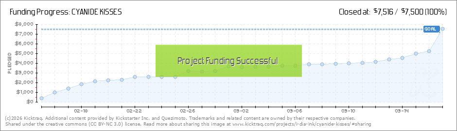 With 40 Pledgers, we've raised $4,011 so far!! We're at 54%!! That's amazing, Thank You So Much As we head into the final few days, we'll be pushing CYANIDE KISSES as hard as possible, trying to catch that Finish Line. I apologize in advance as... (Read More)