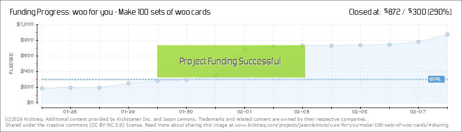Hello! Thanks to everyone for backing - we reached our funding goal! The order for the cards was placed. These should arrive next week, so we'll be on target to ship well before Valentine's Day. If you are watching the project, now is a great time to... (Read More)