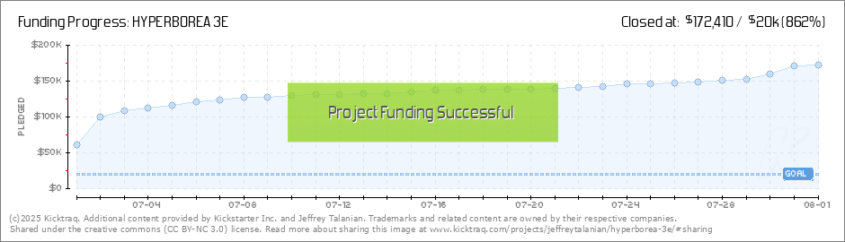 North Wind Adventures set a goal of $20,000 to bring a third edition of the swords, sorcery and weird science-fantasy RPG Hyperborea to life on Kickstarter. The campaign for the game has slaughtered that target. It currently sits on a throne of over 1,000 backers and more than $120,000 in pledges. (Read More)