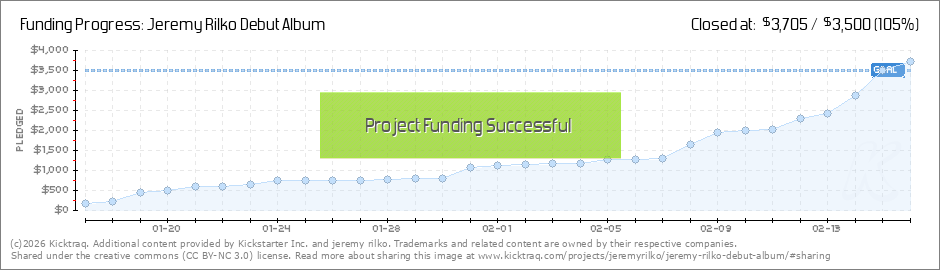 Hey everyone! Thanks for contributing to my project. The recording has wrapped up and has gone to mixing. It should be mastered by next week. There’s just under two weeks left and if we get to $2000 by Monday at 11:59 pm I’ll release another... (Read More)