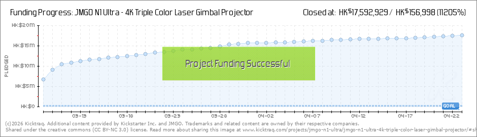 Dear backers, We can't thank you enough for supporting our JMGO N1 Ultra 4K Triple Color Laser Projector Campaign. With your love and support, we are Funded for $400,000 in just 1 Hour!... (Read More)