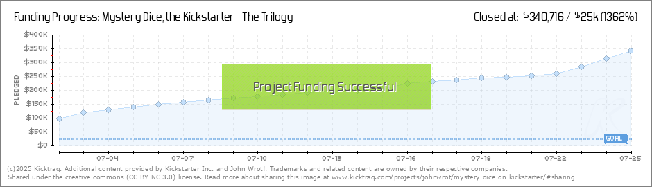 You, my Kickstarter friends have done something amazing! You have fully stretched a Mystery Dice campaign in record time! LOOK! WOOOO!!! At 11:20pm last night an unknown backer pushed it over the threshold from 899.9% funded to 900.1% with a... (Read More)