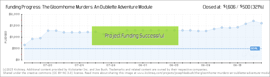 We succeeded, and hit 320% of our initial goal! Thanks SO MUCH to all of you who supported the project! We couldn't do it without you! Up next, I'll be contacting all the commission backers (IE Red Herrings) to get the information I need to write up... (Read More)