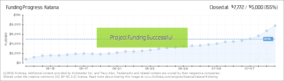 Two stretch goals unlocked at 155% of goal with $7,772 raised from 170 backers over a period of 30 days. We did it! Katana was a successful Kickstarter campaign because of hard work, gracious collaborators, and backers like YOU. Thanks for being a... (Read More)