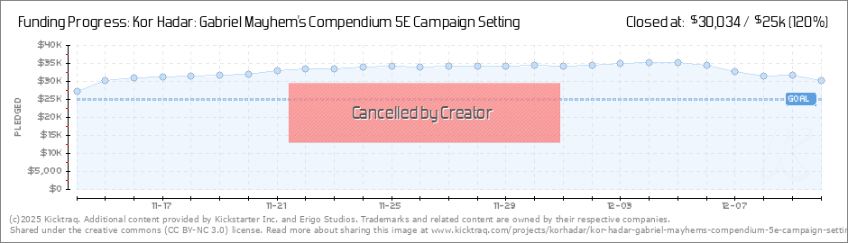 Dear Backers, It is with a heavy heart that we announce the cancellation of the Kor Hadar: Gabriel Mayhem's Compendium 5E Campaign Setting Kickstarter campaign. Despite the incredible support and enthusiasm of so many, the current number of backers... (Read More)